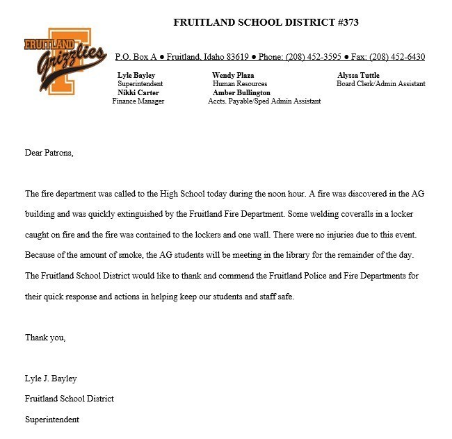 Notice of fire at Fruitland High School