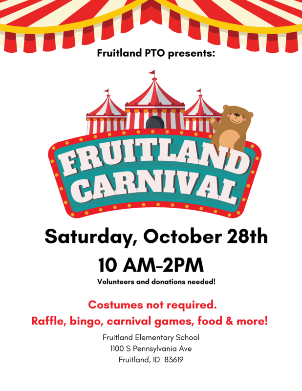 Fruitland PTO Carnival will be Saturday, October 28, 2023, from 10 am to 2 pm.