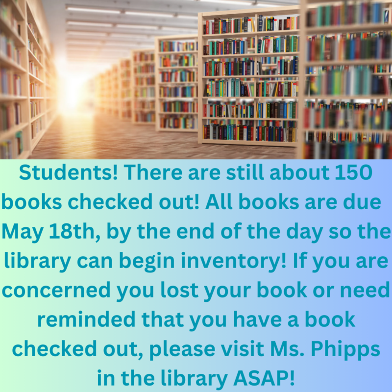 Students! There are still about 150 books checked out! All books are dueMay 18th, by the end of the day so the library can begin inventory! If you are concerned you lost your book or need reminded that you have a book checked out, please visit Ms. Phipps in the library ASAP!